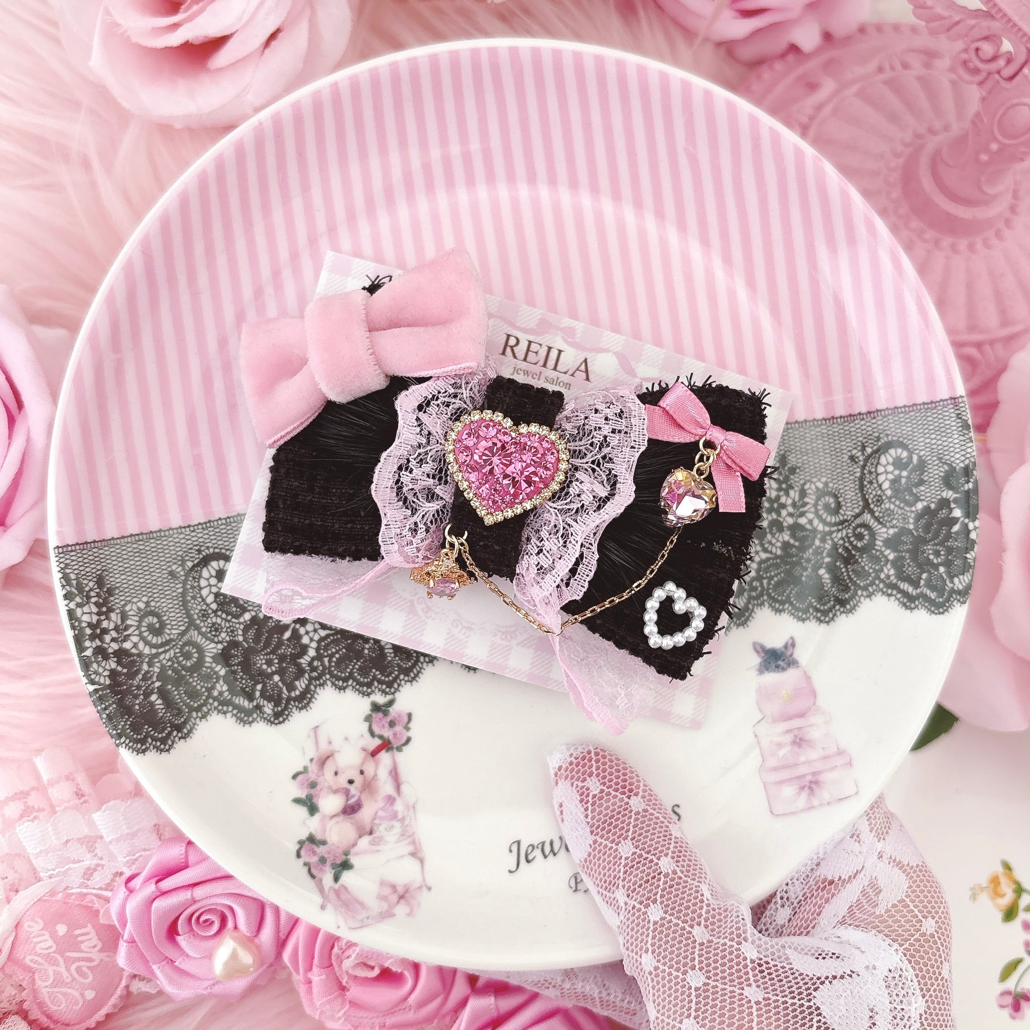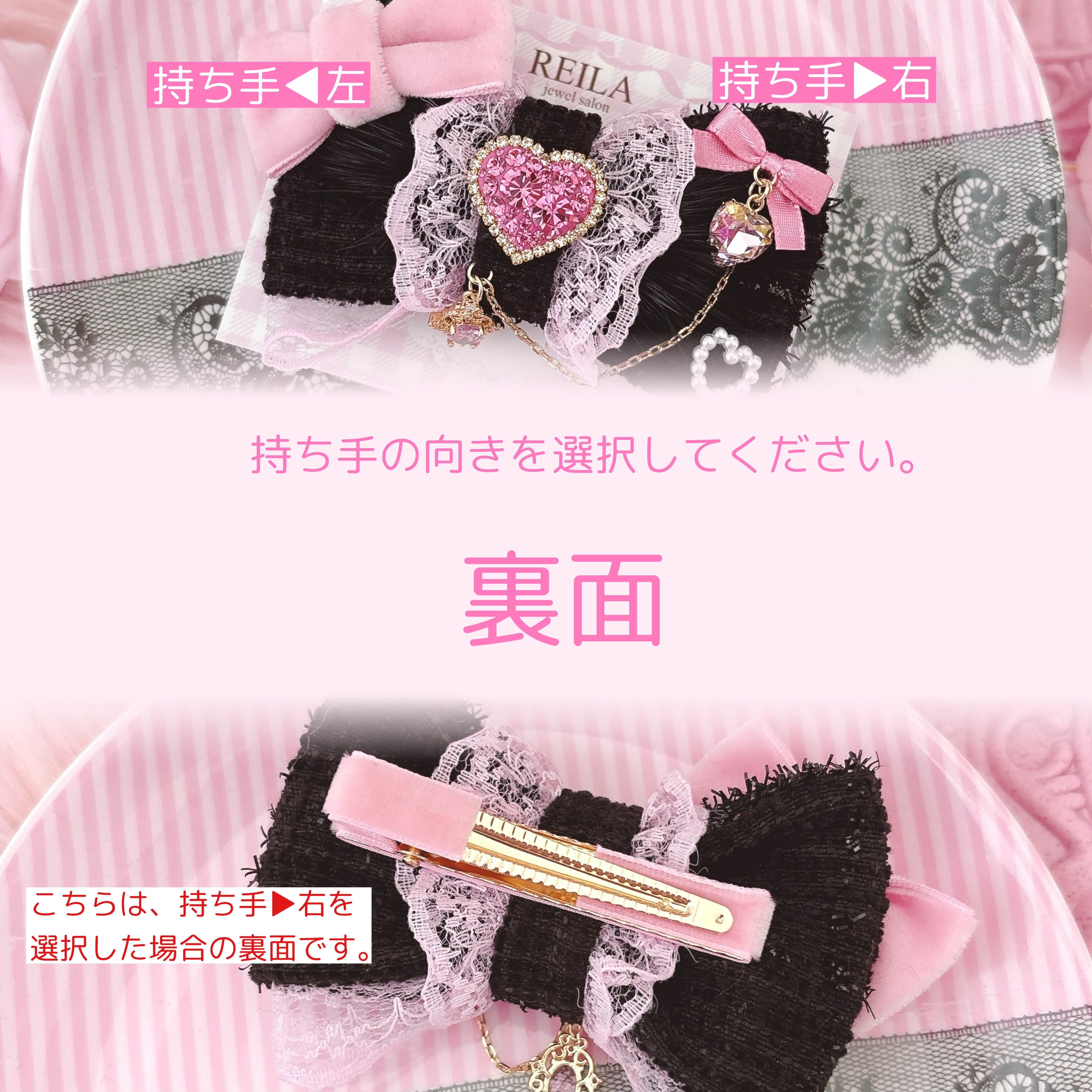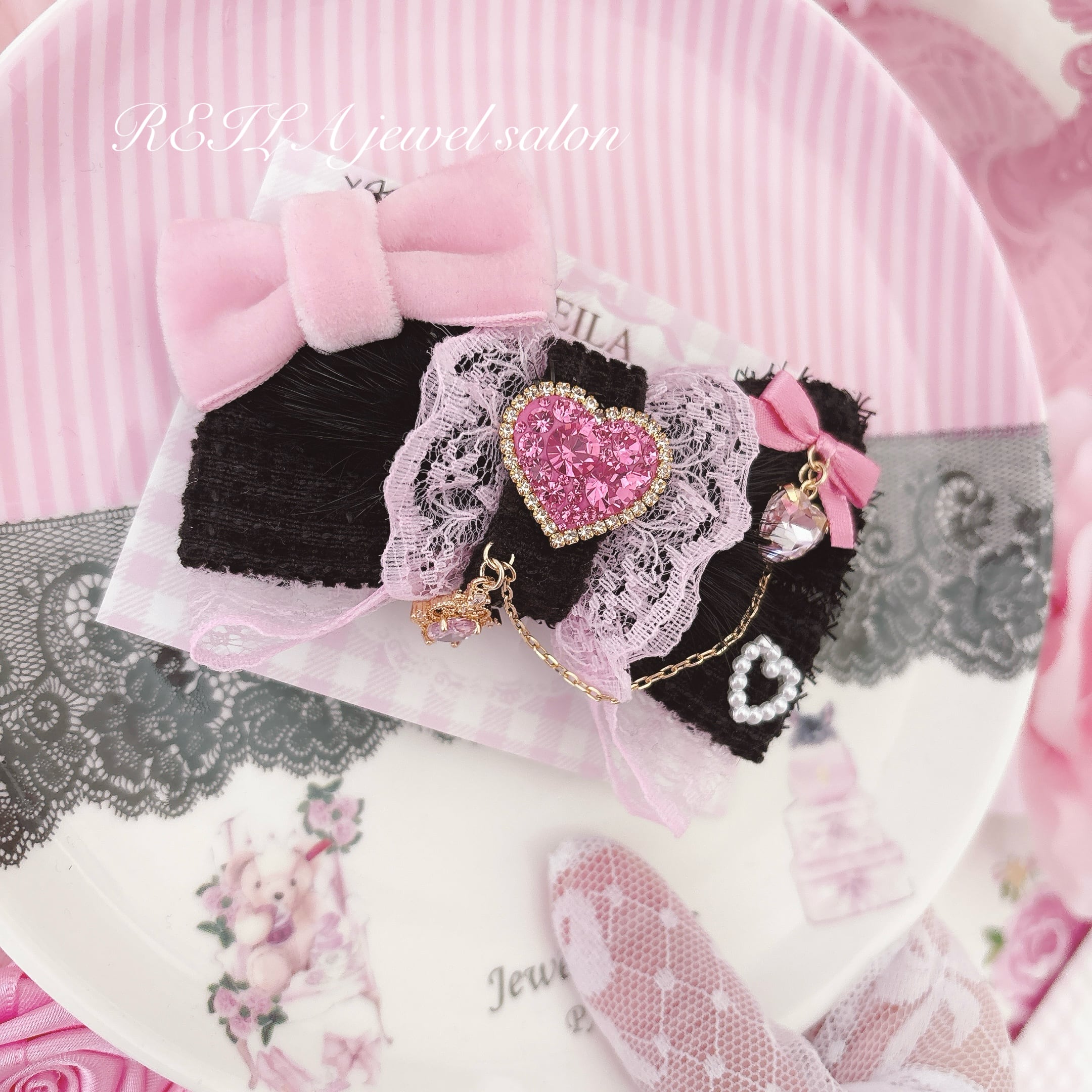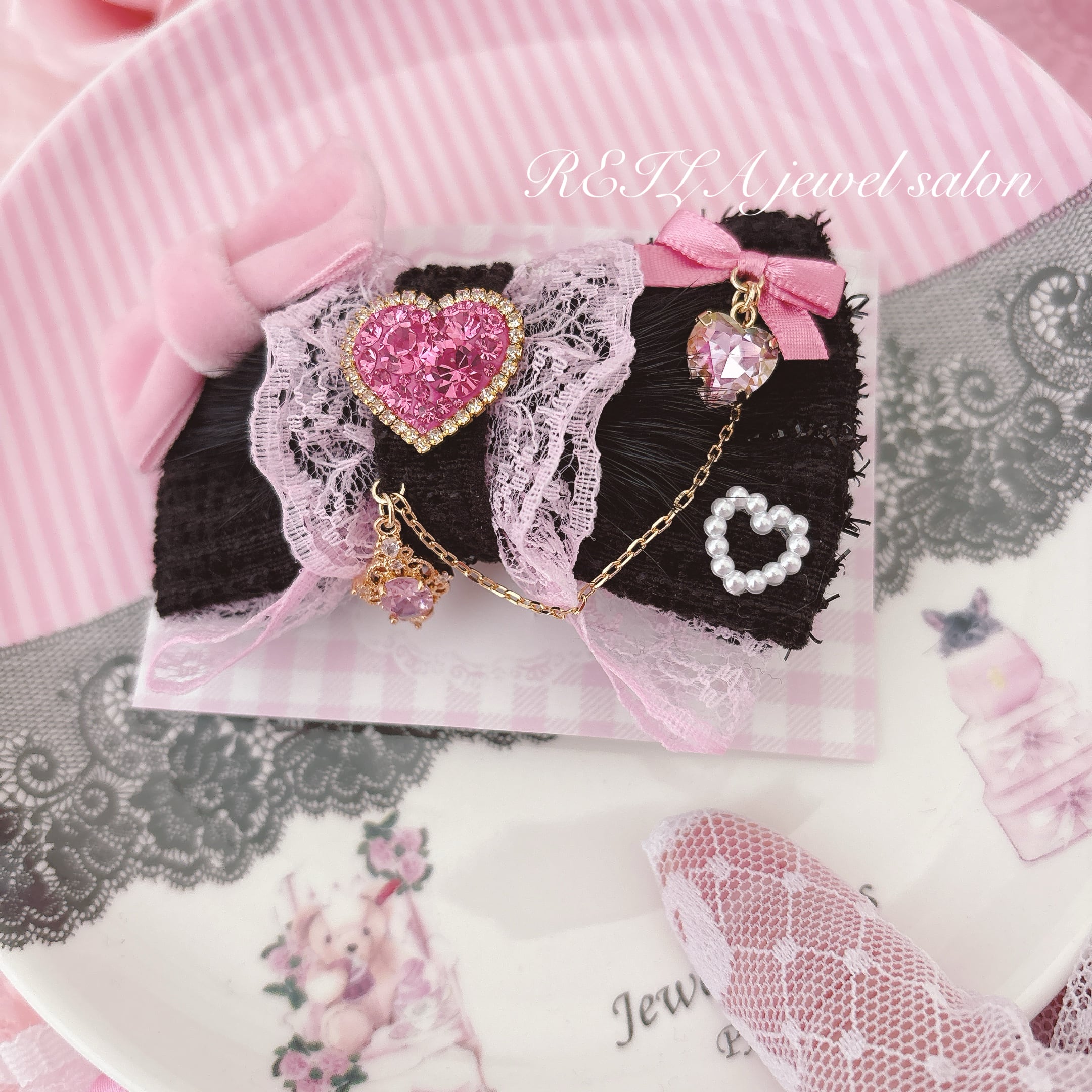 グルーデコで制作したデコモチーフやツイード生地を使った小悪魔カラーのおリボン♡
