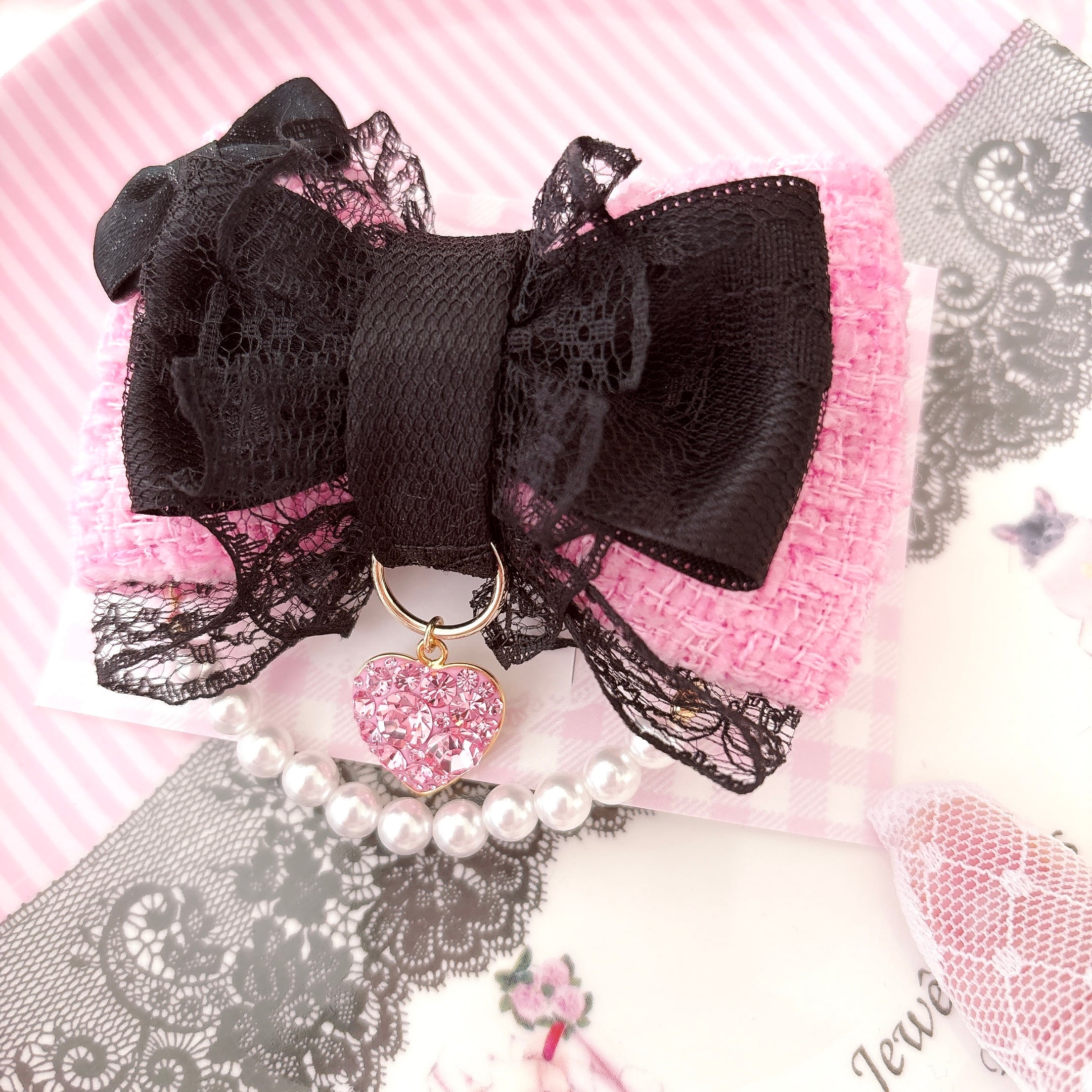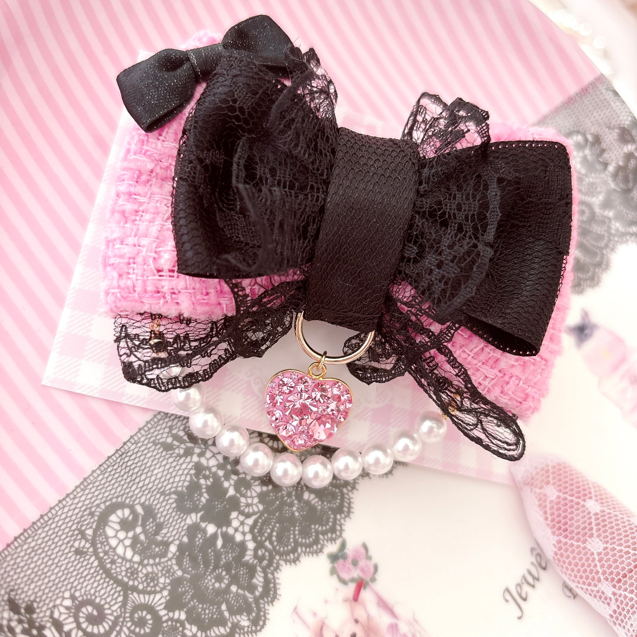 グルーデコで制作したキラキラピンクチャームと パールチェーンの付いた小悪魔ピンクなおリボンです♡